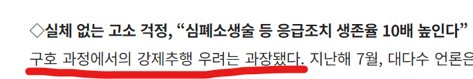 실체 없는 고소 걱정, “심폐소생술 등 응급조치 생존율 10배 높인다” 구호 과정에서의 강제추행 우려는 과장됐다. 지난해 7월, 대다수 언론은 지하철에서 쓰러진 여성을 남성들이 성추행을 우려해 도와주지 않았다는 취지로 기사를 작성했다. 그러나 일부 언론과 당사자가 밝힌 결과, 실제로는 남녀노소 할 것 없이 서로 도왔던 것으로 드러났다. 진위를 확인할 수 없는 사례들이 퍼졌기 때문에 강제추행과 고소에 대한 우려도 실체 없이 커진 것으로 보인다. 기사에서도 말하네 실체없는 우려를 믿지말자 | 24.07.29 13:43 | | |