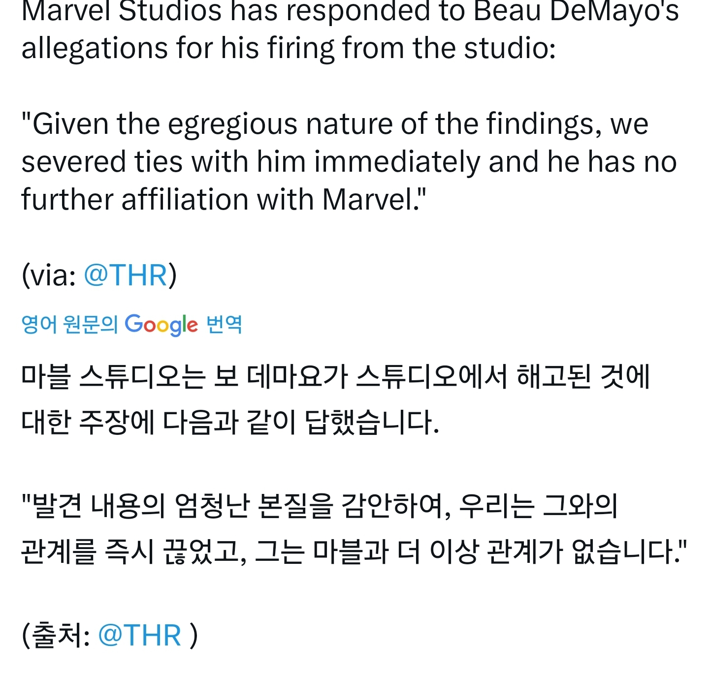 본문 마지막에 갈무리된 엑스맨 정보 계정도 사태 초기에는 보 드마요를 옹호하고 디즈니와 마블을 비판했으나