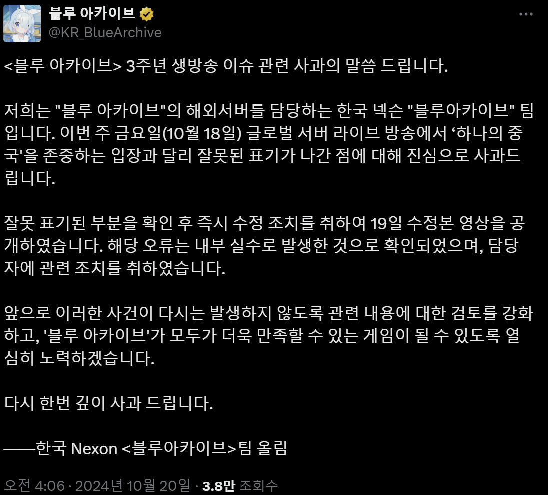 3주년 방송때 '국가'별 접속자수?였나 그래프 나온게 있는데 거기 대만을 적어놔서 중국 유저들이 ㅈㄹ했다고 들음. 그래서 생방영상도 내려갔다가 해당부분을 '서버'로 고쳐서 재업했다고 하고 | 24.10.20 06:49 | | |