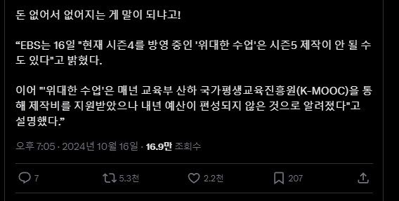 EBS가 검증해서 인기있는게 아니라 해외의 저명한 교수가 강연하니까 다들 보는건데 조금 다른 이야기일지도 | 24.10.31 11:16 | | |