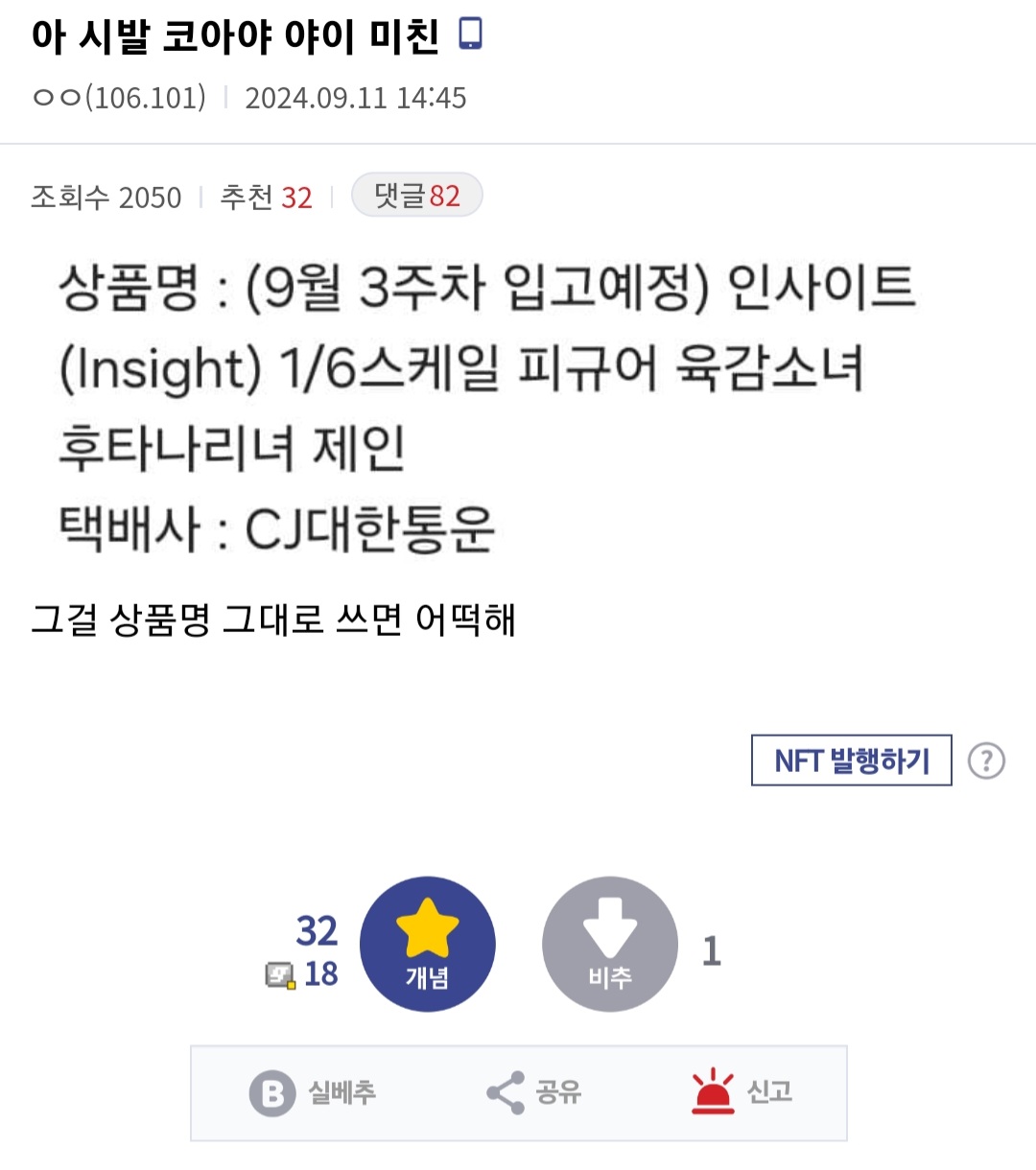 주소야 상식적으로 당연히 확인하는거고 정확한 상품명이 뭔지 확인 하냐 안하냐 궁금하다는거임 그냥 아 식품이구나 장난감?같은 거구나 이렇게만 확인하는지 이건 1/6 후타나리 피규어구나 이렇게까지 확인하는지 궁금하다는거 | 24.11.02 11:51 | | |