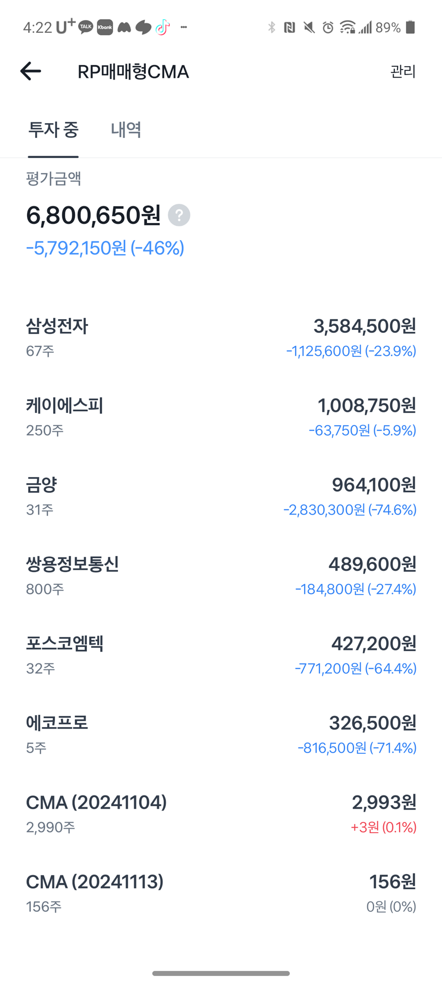 헛 웃음 나오네.. 내 아버지도 금양 샀는데 아직 들고 있나 확인하니 들고 있네... 에코 프로도 사서 안고 죽고 말이지... 아버지가 주식 5천으로 시작했는데(3천 퇴직금, 2천 어머니에게 빌림-> 2천 전세 받은거였..) 아직까지 출금 한번 한적없음.. 꽤 오래 했는데 말이지... 갑자기 내 명의로 바꾼다고 해서 해주고... 그때 2200인가 남았었음... 거기서 전세 2천 다시 줘야해서 700뺀후에... 1500만원 가량 주식 남았는데 700도 안남았네... 원래 2200 다 처분할라했는데 욕하고 해서 700만 뺐거든... 환장하것구만