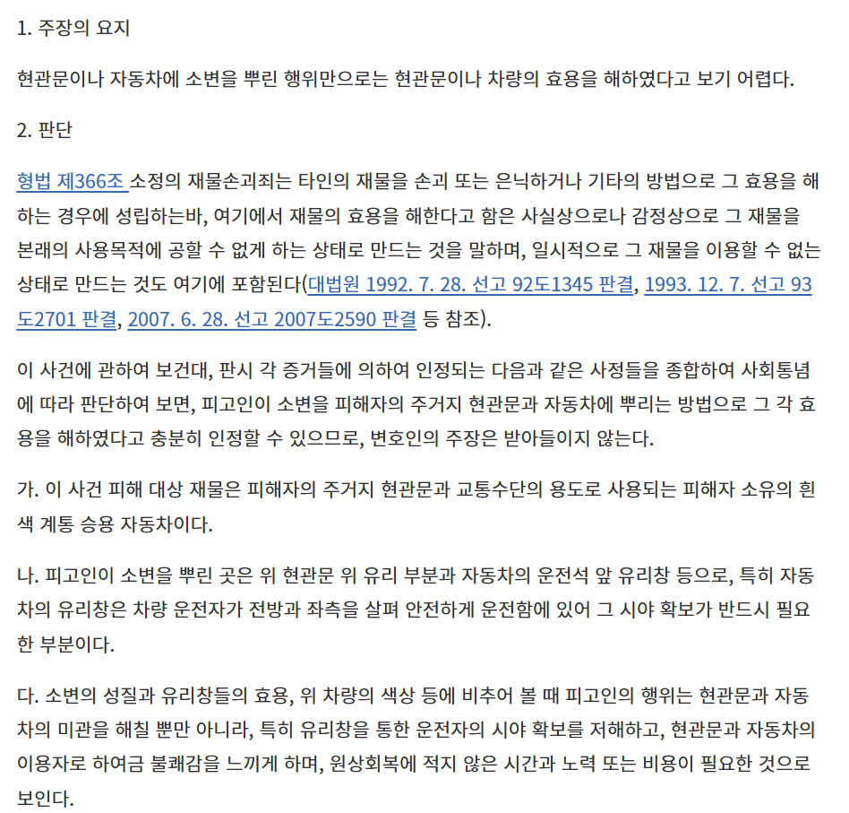 재물손괴는 복원가능하냐로 무죄나는거 꽤 있더라 예를들어 남의 건물이나 차에 대고 소변갈긴다던가 하는건 그냥 세차하면 끝이기 때문에 손괴도 뭣도 아님