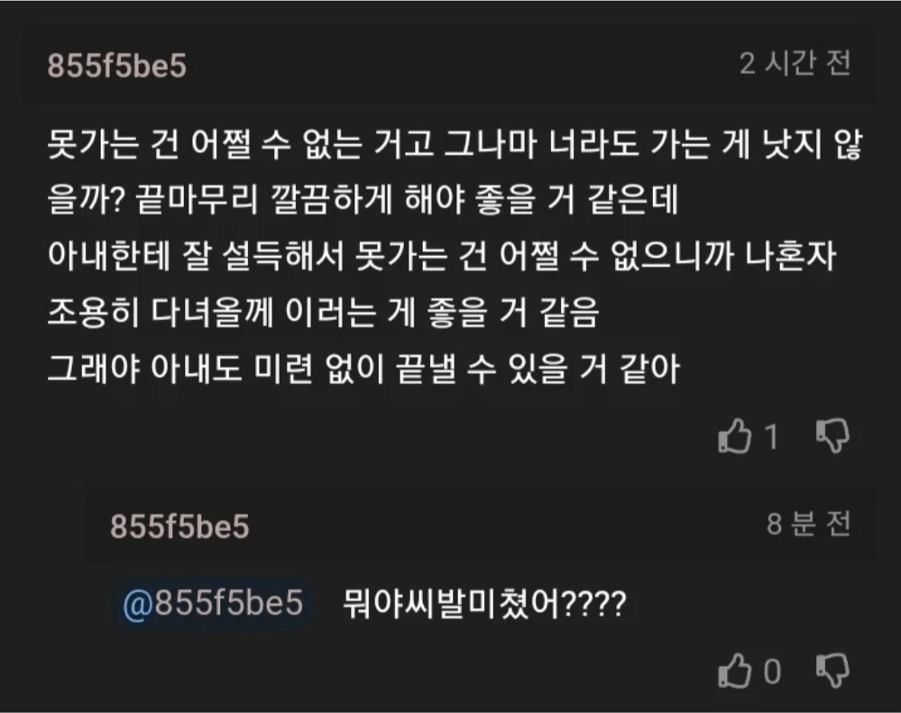 그게 아니라 불륜한 건 고인과 글쓴이의 현와이프 고인과 헤어지고 글쓴이랑 결혼한듯? | 24.11.30 18:50 | | |