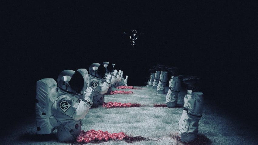 저 합장하는 우주비행사들로 만들어진 카펫도 존나 기괴함 과학의 최첨단을 달리는 최고의 지성도 기도하게 만드는 근원적 공포라는걸까 무슨 뜻인지 궁금함 ㄷㄷ