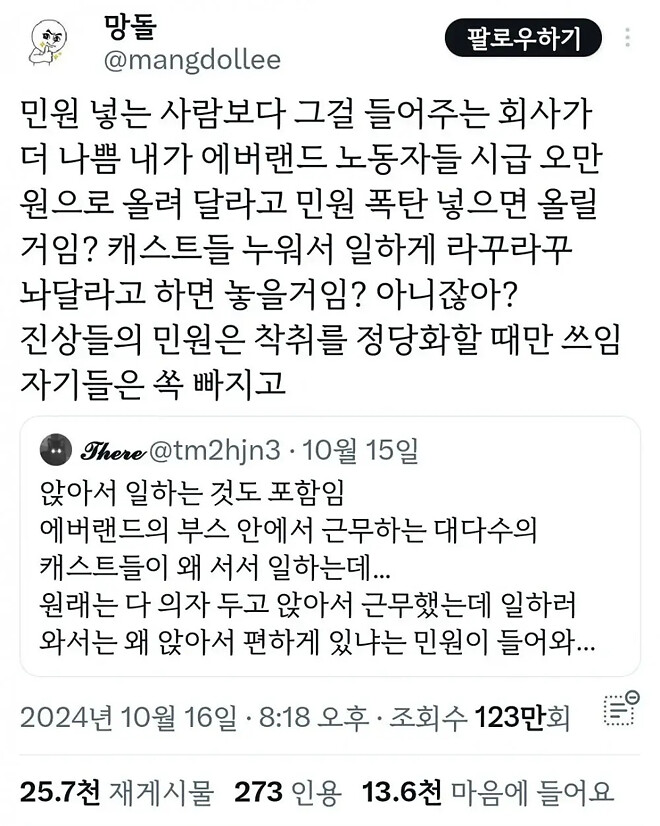 고객센터는 직원조차 아니고 걍 외주지 민원은 민원응대 자체에만 영향을 주는게 아님 그걸 다른 업무에다가 반영을 시키니까 | 24.12.10 16:01 | | |
