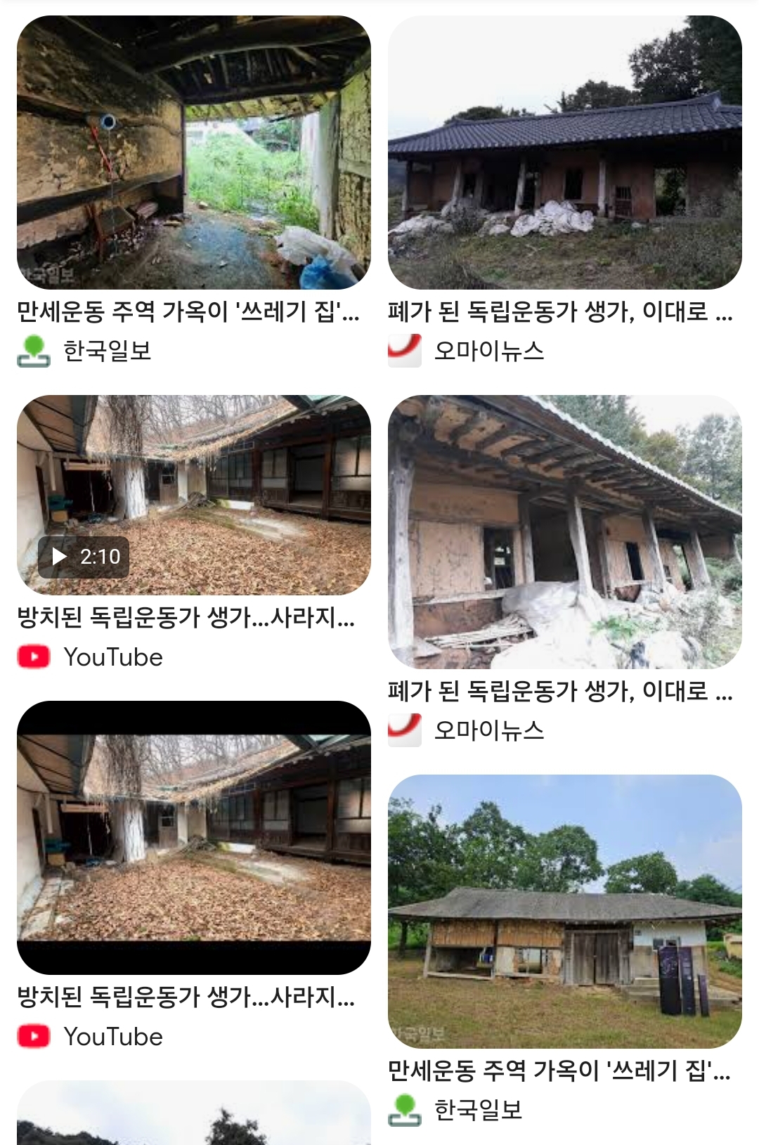 그리고 치욕스러운 역사를 덮기보단 마주하고 다신 그런일 없게 하는 것도 중요하가 독립운동가 생가도 모든 독립운동가 생가를 관리 안 하는게 아님 대부분 개인재산이기 때문에 관리 못 하는 경우가 더 많다. 기증 혹은 이전에 매입한 건축물들은 잘 관리 되는 곳들도 많음 | 24.12.13 10:48 | | |