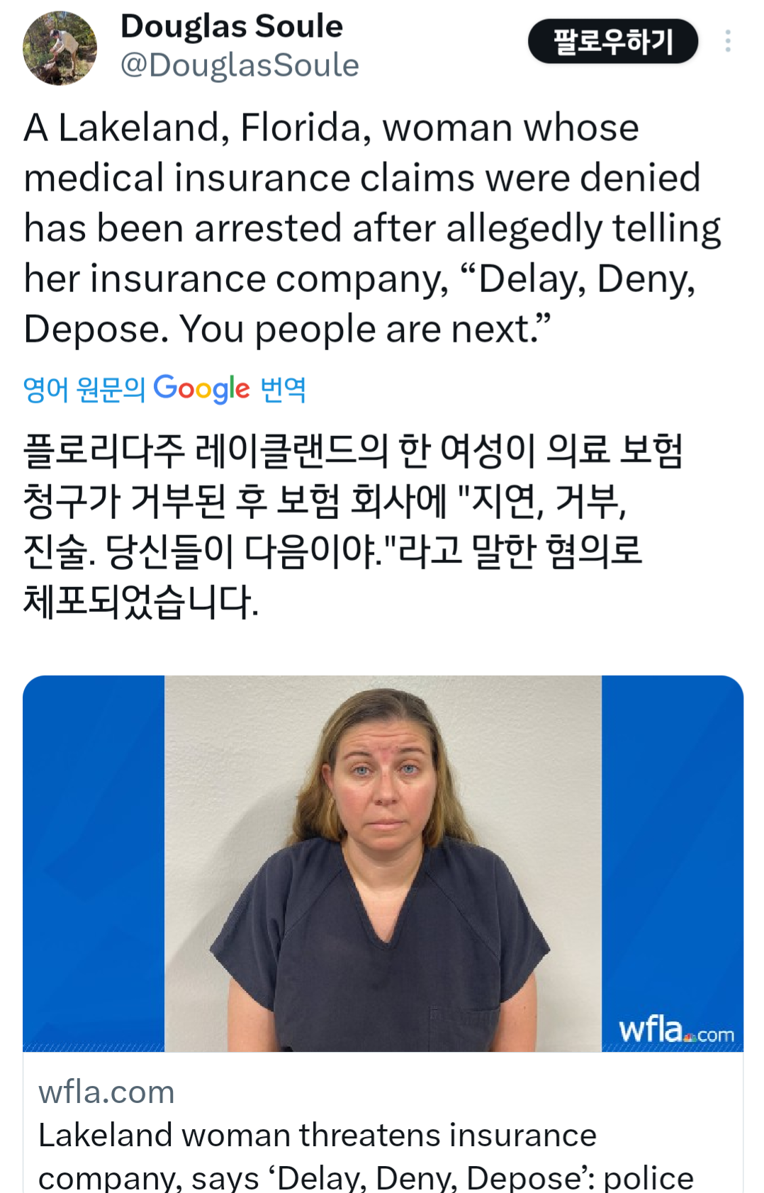 DELAY, DENY, DEPOSE 거부하고 방어하고 처분하라 이 말뜻이 젤 위협적으로 다가왓을수도 잇음 이게 그 CEO 암살범 탄피에 적혀잇던 단어니까.. 나도 협박과는 별개로 보험사가 정신차려야한다는 입장이긴함.. 미국에선 정치문제까지 섞여잇어서 그리 간단한 문제는 아니다만... | 24.12.13 19:38 | | |