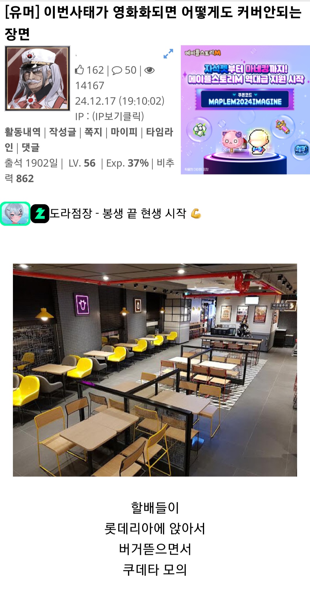 알바:저기... 혹시 계엄...? 군인:아이고 학생 고생이 많아요 이거 커피 내가 살테니까 긴장풀고있어 | 24.12.17 20:09 | | |