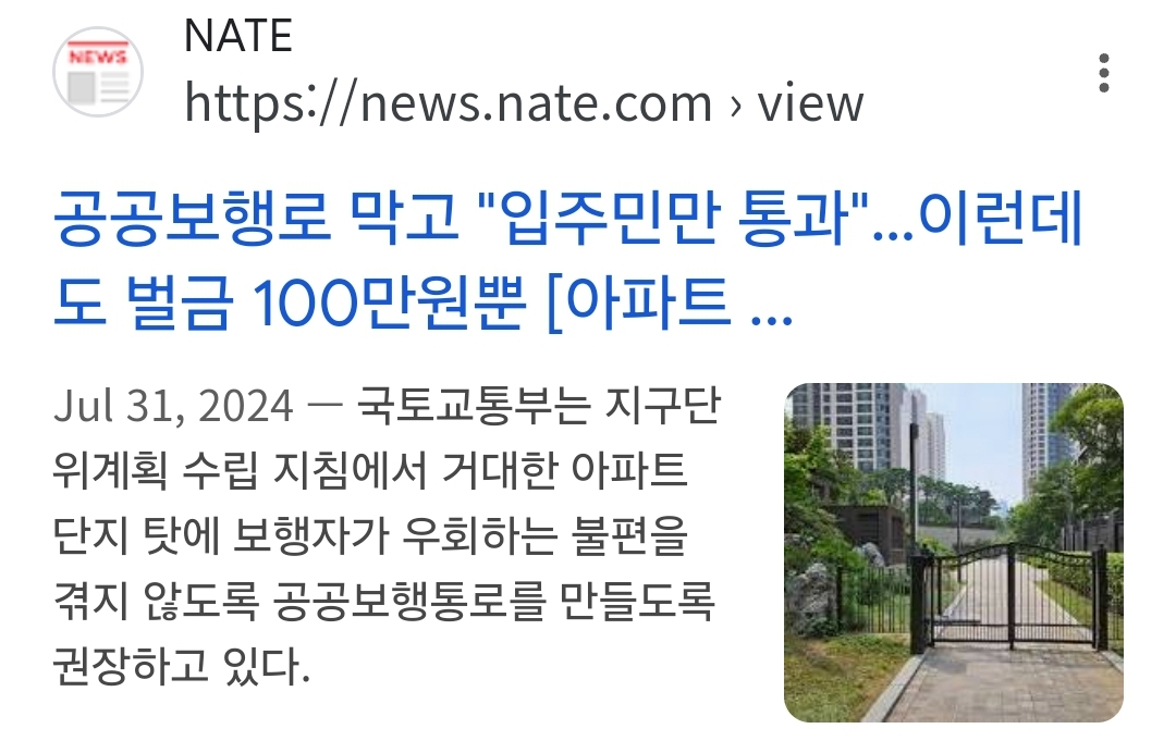 내부 부대시설은 그럴 생각이 들만함 어쨌거나 주민들이 내는 관리비로 보수하는 거니까 근데 저렇게 막는건 그런 부대시설의 입구에 하는게 더 효과적일텐데 그럼 비용이 너무 비싸져서 아예 입구부터 막으려는 건가