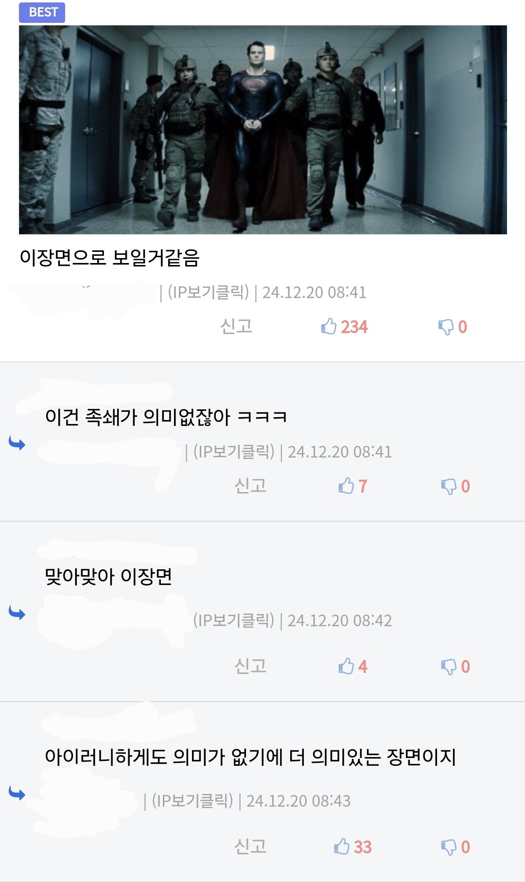 슈퍼맨은 자기손에 찬 수갑하고 완전무장하고 호송하는 군인보고 무슨생각할까 ㅋㅋ