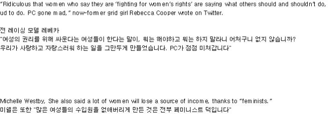 (워싱턴 포스트) ‘PC gone mad’: Formula 1 bans grid girls, and grid girls blame feminists (Feb. 1, 2018) https://www.washingtonpost.com/news/early-lead/wp/2018/02/01/pc-gone-mad-formula-1-bans-grid-girls-but-some-of-them-arent-happy-about-it/?utm_term=.5c33aff114d9 "'탈코르셋' 안 했다고 '흉자' 취급"… 女·女 갈등 확산 (2019-02-03 12:00:00) https://m.segye.com/view/20190202001110 ‘탈코르셋’이라는 코르셋, “화장 하건 말건 내 자유” (2018.06.18 16:57) https://news.joins.com/article/22725868 국내 탈코르셋 이슈때도 생각나고