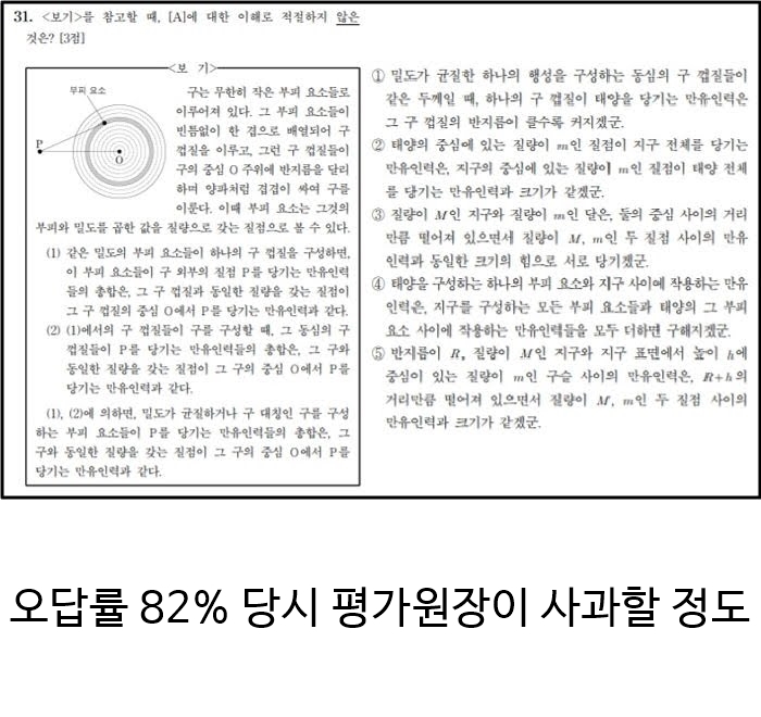 애당초 국어 실력이 있어야 과학 지문을 보고 이해할 수 있으니까? 지문만 봐도 답이 나오긴 함. 1 3 4 5는 설명이 있는데 2는 설명이 없음. 물론 물리1만 배웠으면 지문도안읽고 바로 답 쓸 수 있음. 이게 오답률 82%인 이유는 지문 [A]를 읽고 틀린 보기를 고르라는게 아니라, [A]에 대한 적절하지 않은 이해를 묻는 문제라서 그럼. 보기 2번이 틀렸다는 사실이 지문에 대놓고 써있는건 아니라서 이게 틀린건지 내가 이해를 잘못한건지 구분이 어려움;; | 24.12.26 12:17 | | |