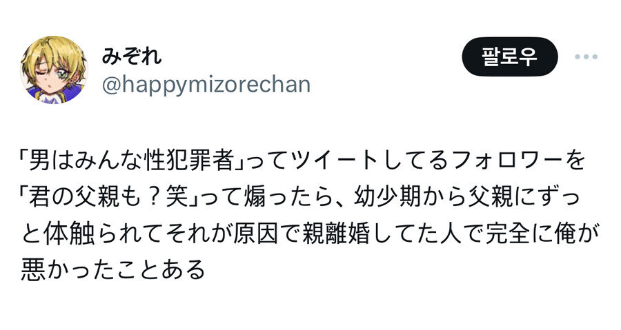 설령 모든 문면이 사실이라고 쳐도, 단순히 부모가 유아를 상대로 할 수 있는 신체적 접촉을 뇌내 악마화 작업으로 왜곡시켰을지는 본인도 모르는 일 | 24.12.26 14:28 | | |