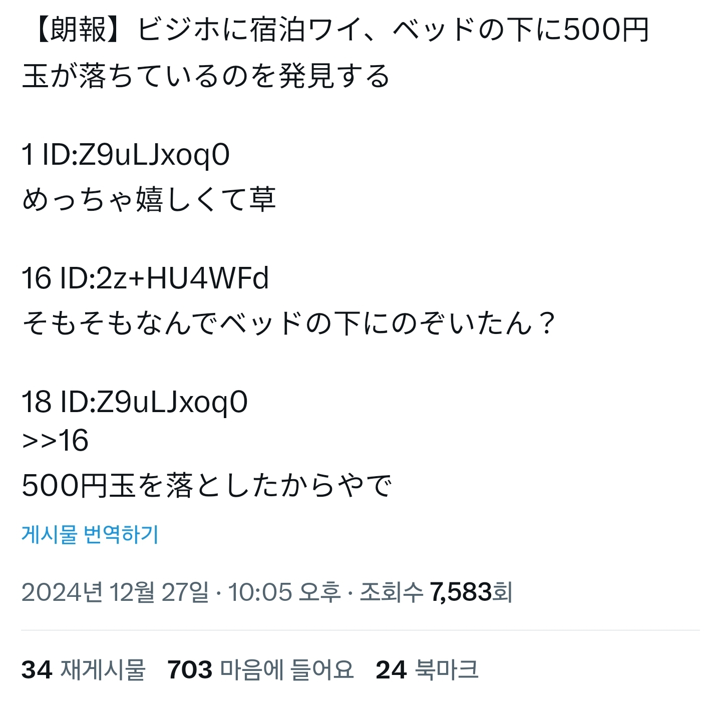 침대 밑에 500엔을 떨어트렸더니 침대 밑에 5백엔이 있었습니다
