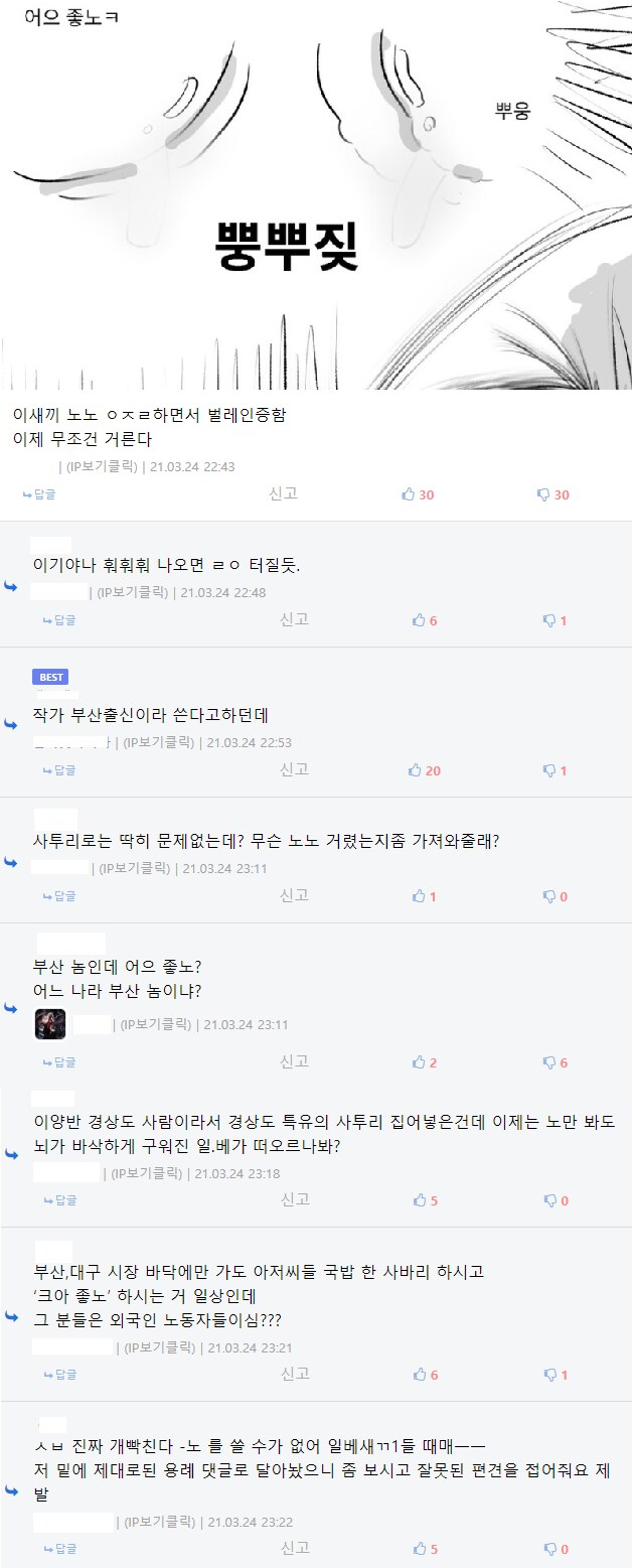 그냥 리버스 일베임 '전라도욕 하고싶지 않은데 왜 자꾸 저런놈들 나옴?'했어봐 개욕처먹고 신고당했을건데 저런 댓글은 추비추 반반임 부산사투리도 히니가 아니라 천차만별인데 잘 모르면서 발작하면서 일1베로 몰아가는것도 그렇고