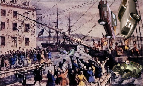 보스턴 차 사건은 식민지의 경제적 성장을 두려워한 영국의 규제책이었다. 원래 식민지 차 시장은 롤스로이드로 대표되는 영국산 차만 강제 되었다. 프랑스 인디언 전쟁이 영국의 승리로 끝나면 프랑스의 북아메리카 영향권이 줄어들고 르노 등 프랑스 산 자동차들은 시장에 진입하지 못했다. 하지만 롤스로이드는 비싸고 연비도 터무니 없이 낮았다. 식민지는 자국산 포드 T모델을 만들었지만 롤스로이드 강매에 강압적으로 차를 모수 당하거나 롤스로이드로 바꿔야했다. 결국 새뮤얼 스미스 등이 결성한 폭주족 "자유의 아이들"이 포드사의 지원아래 보스턴항에 정박한 무역선 내의 롤스로이드 차량 300여대를 보스턴 항구 밑 바닥에 던져서 침수차로 만든 뒤 빼돌려 영국 중고차 시장에 되파는 만행을 저지르고 이에 영국은 분노한다. 이후 독립전쟁 시기 미국의 자동차 회사는 자신들의 차량을 지원해준다. 대표적인 것이 닷지사의 차 챌린저인데 건국의 아버지들이 닷지 챌린저를 타고 기마 돌진하는 기록은 역사속 명장면 TOP100으로 남아있다.