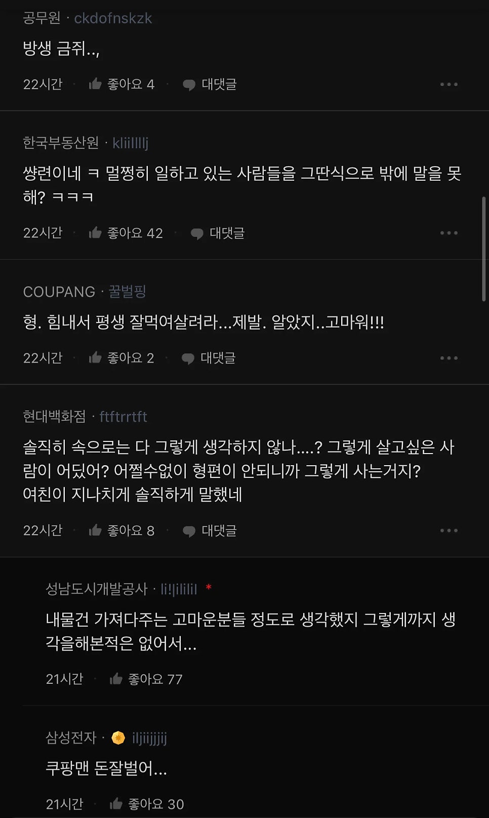 ㅇㅇ. 실제로 쿠팡맨을 어떻게 생각하고 말고를 떠나서(그건 뭐 개인 경제력에 따라 다를 수도 있지) 특히 중요한 부분은 남친이 '저 사람들 대단하다'라고 이야기하는거에 대한 대답이 '찌질하다'라는 건 대화 수준이 낮은 거지. | 24.12.31 19:01 | | |