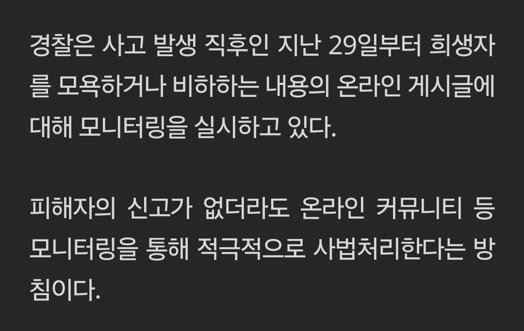 근데 유가족 말고 희생자분들에 대한 사자 명예회손은 친고죄 아닌가? 모욕죄는 형사는 안되고 민사로 가야 한다고 아는데... 경찰이 선개입할 수 있는 부분인가 궁금하다 | 24.12.31 19:37 | | |