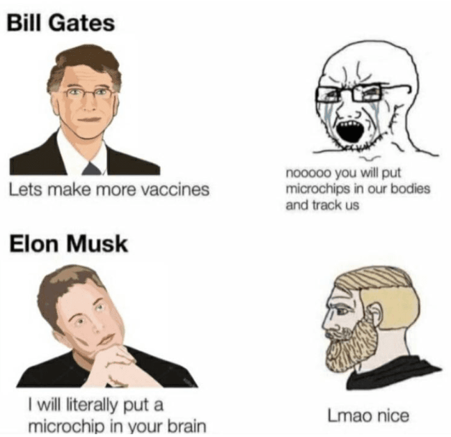 빌게이츠 : 백신 만듭시다. 사람들 : 게이츠 이놈이 사람 몸에 칩 넣을라고 한다! 머스크 : 뇌에 칩 넣죠 사람들 : 오 쩐다!