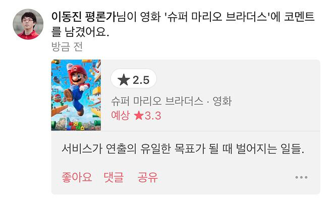 마리오 게임은 해 본 적 없는 초등학생 조카가 넋을 잃고 세 번 봤네요. | 25.01.04 13:30 | | |