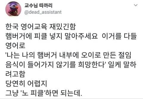 여행 때 조금 쓸 생각이면 "노 피클" 이라고 배워도 됨. 하지만 직장에서 영어로 서류 작업하거나, 영어로 업무를 보려면 '정중한' 영어를 사용할 줄 알아야 함. 거래처 외국인한테 '피클 극혐!' 하면 망함. '제 햄버거에는 피클을 넣지 말고 주세요.' 라고 말 할 줄 알아야 함. | 25.01.04 15:15 | | |