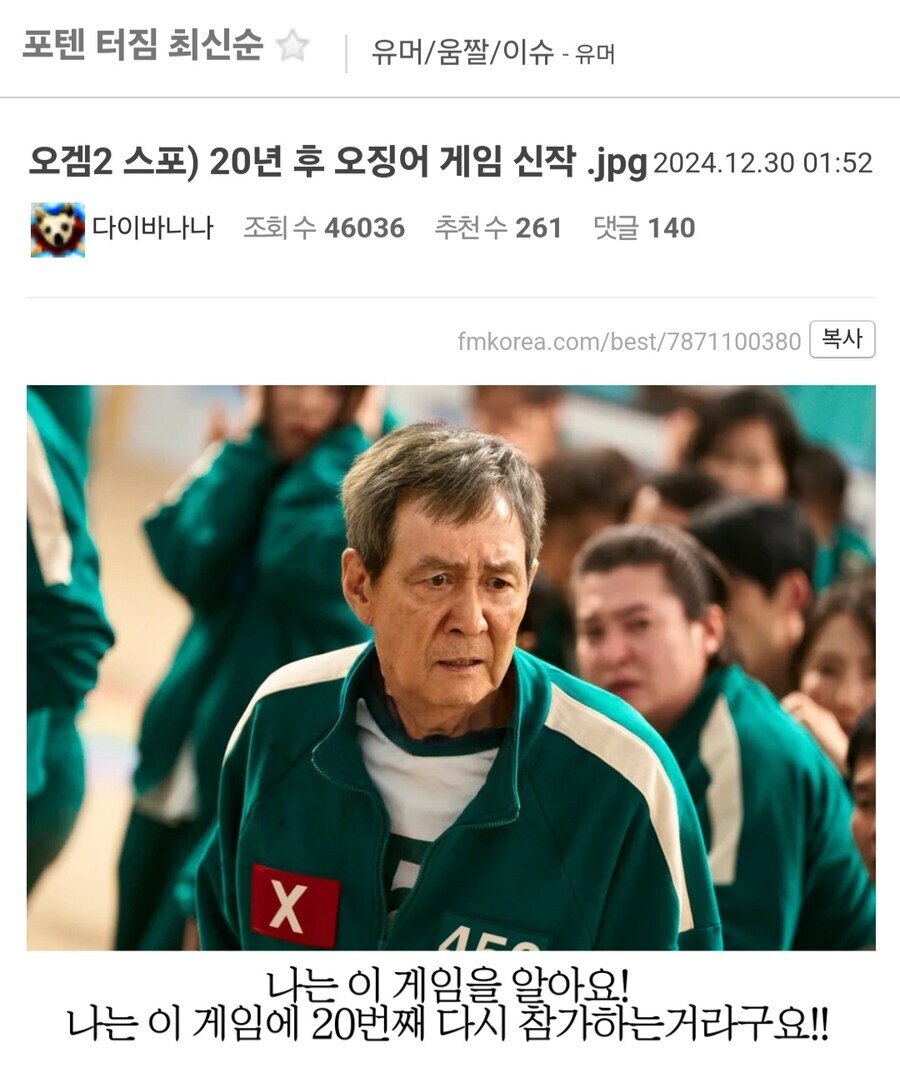 20년째 참가하면서 살아남았다는건 나머진 다 죽었다는건데 이쯤되면 성기훈 본인이 약간 명탐정 코난같은 위치 아님? ㅋㅋㅋㅋㅋㅋ
