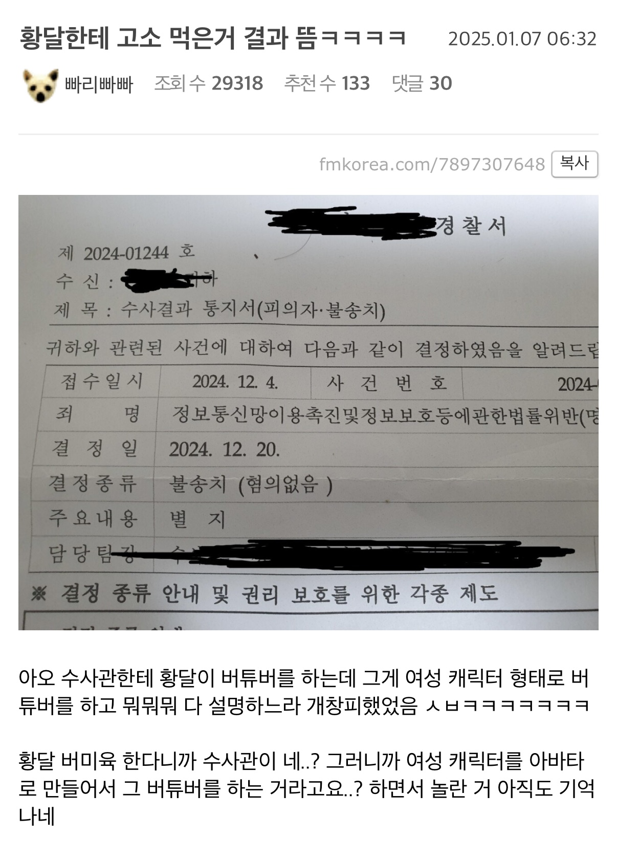 경찰서에서 나온 문서로 불송치 적혀있는데? 그럼 검찰로 송치도 안되고 경찰 선에서 컷 아님? | 25.01.07 09:50 | | |