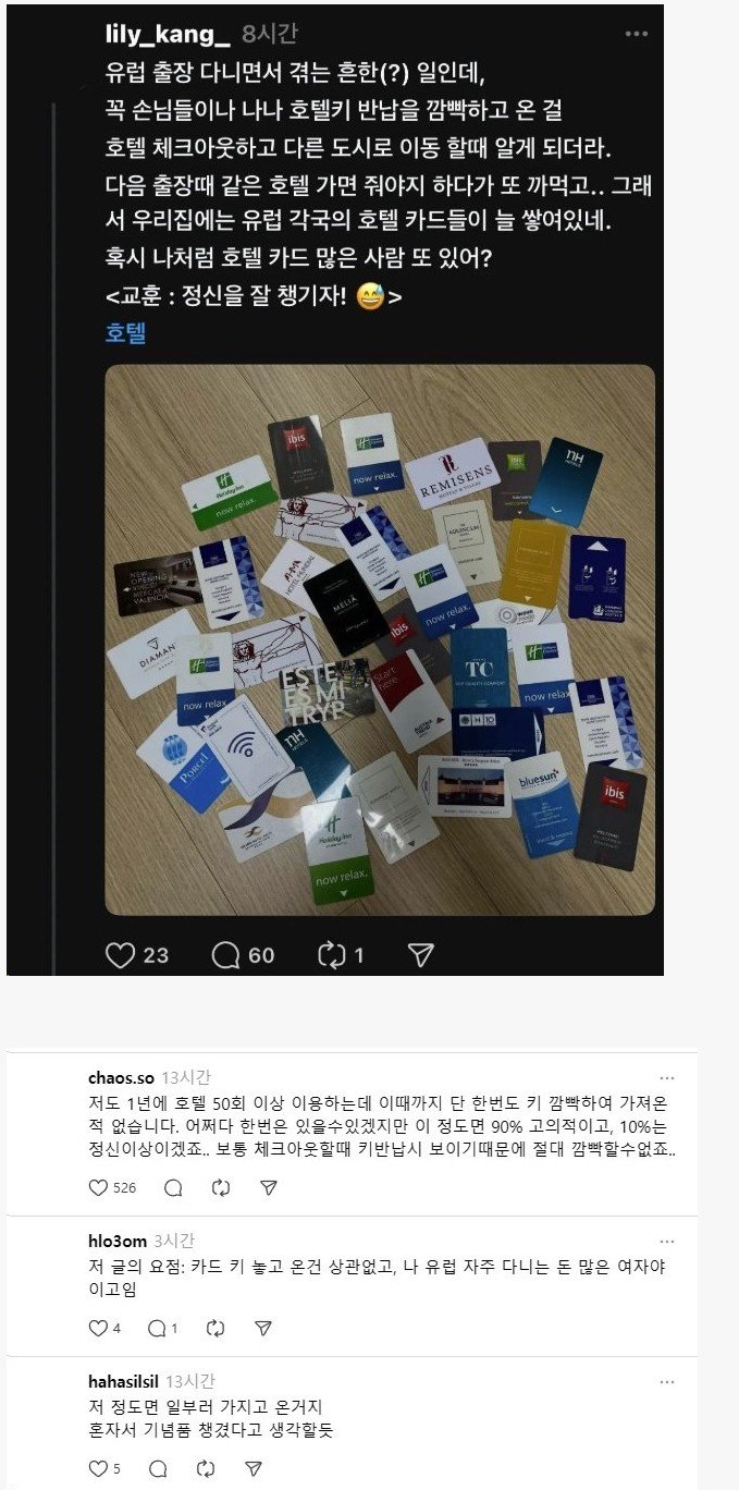호텔에 한달쯤 살면서 매번 방에 키 놓고 와서 재발급 받다보니 키 10개쯤 쌓아뒀는데 실수로 1개 반납 안해도 모르던데 | 25.01.07 19:36 | | |