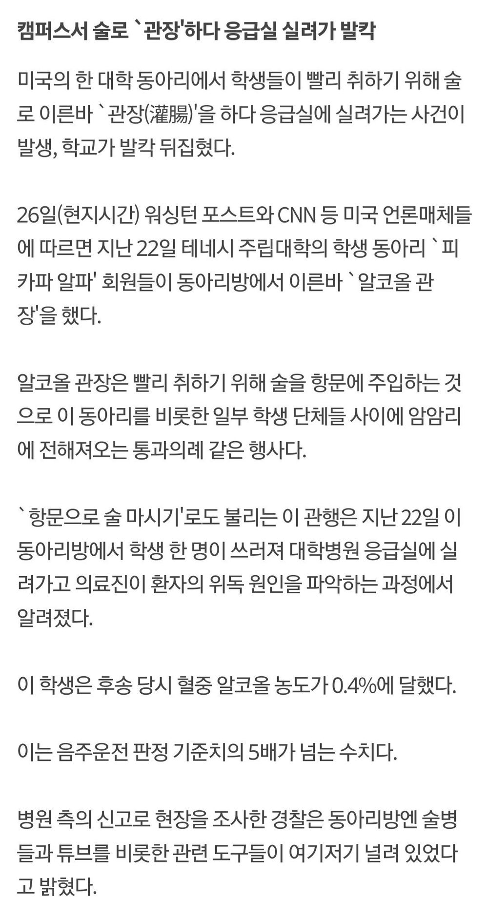 ㅅㅂ.... 어떻게 대학생이란 새끼들이 응꼬는 모세혈관이 엄청나게 잘 발달되어 있어서 거기로 술쳐넣으면, 위험할 정도로 급격히 혈중 알콜농도가 치솟을 수 있다는 것도 모름? 좌약이 왜 있겠냐 ㅄ들아...