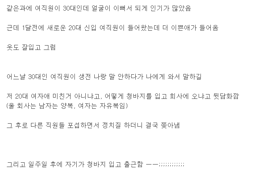 음 적어도 맨 마지막 30대 여과장이 20대 사원을 쫓아낸 일은 나도 겪었음... 존나 음습하게 정치질 하고 아침에 출근 시켜서 정수기 닦고 자기가 두고간 설거지감 닦게 만들고 그래서 여직원 나감 ㄷㄷ | 25.01.08 17:24 | | |