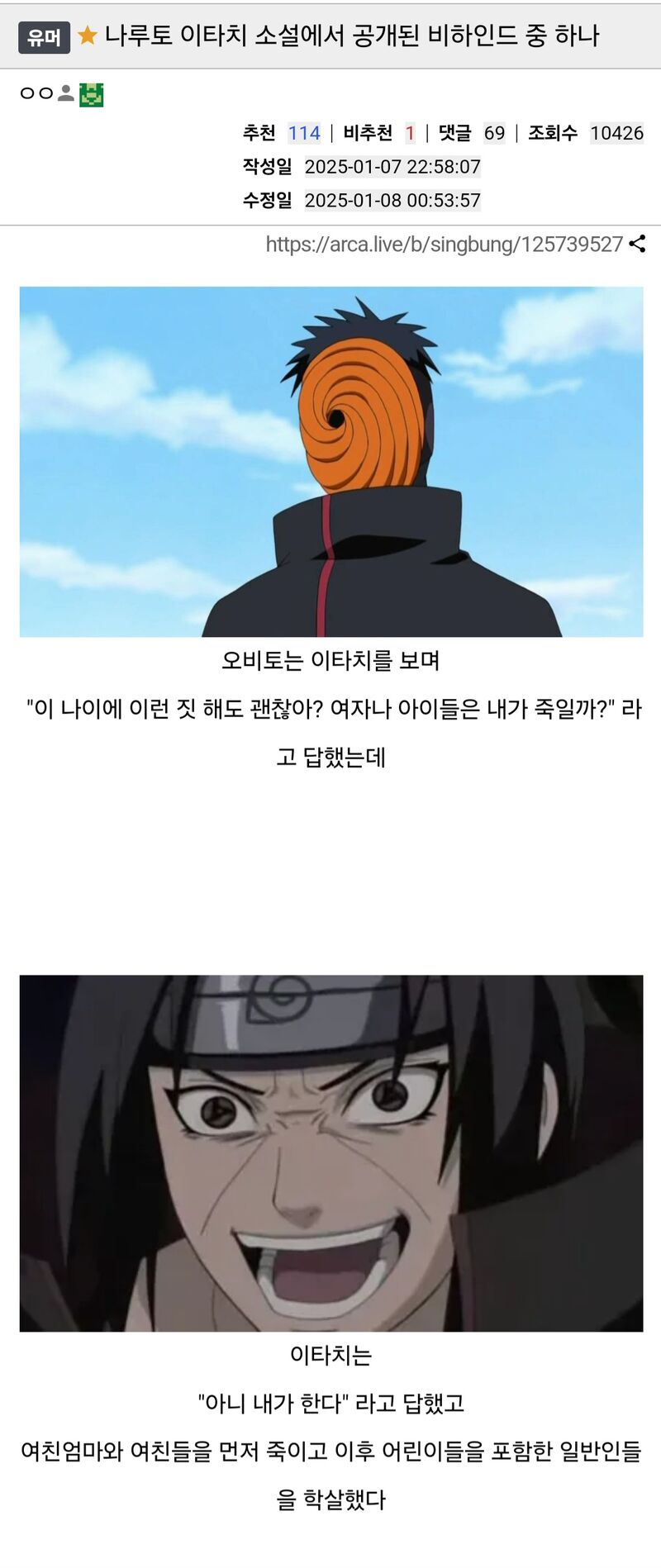 아 최후의 자비로 인생 분량으로 이타치랑 결혼하고 자연사하기까지의 환술 걸고 자연사 시켰다고 ㅋㅋ | 25.01.09 01:49 | | |