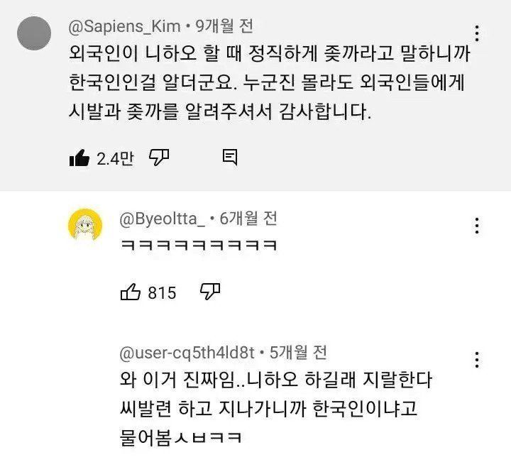 외국인 : 내가 네이티브 ㅆㅂ 들려줌 외국인 : 니하오 ??? : ㅆㅂ롬이 뭐라는거야 ㅆㅂ 외국인 : 오 ㅆㅂ~! 코리안~!