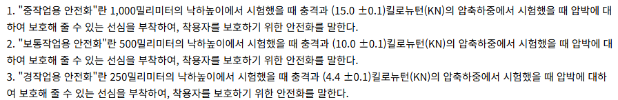 강철 중작업용(H용) 및 보통 작업용(S종)의 가죽제 안전화 선심으로 강철(SK7) 또는 이와 동등 이상의 강도를 가진 재질을 사용합니다. 수지 안전화용 선심은 수지를 용융하여 유리섬유 촙을 혼합하고 금형에 주입하여 성형하는 방식으로 제조합니다. 적합한 수지 재료를 선택하고 배합하여 KS 보통작업용 안전화 선심의 규격에 맞는 물성을 얻을 수 있습니다 보통 안전화가 10kn이고 중작업화가 15kn | 25.01.11 06:36 | | |