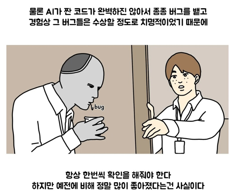 나도 솔직히 이래 생각함.. 나 같은 경우 나 혼자 일해서 설계부터 다하는데, ai한테 이런거 물으면 안해주잖아.ㅠ | 25.01.12 01:04 | | |