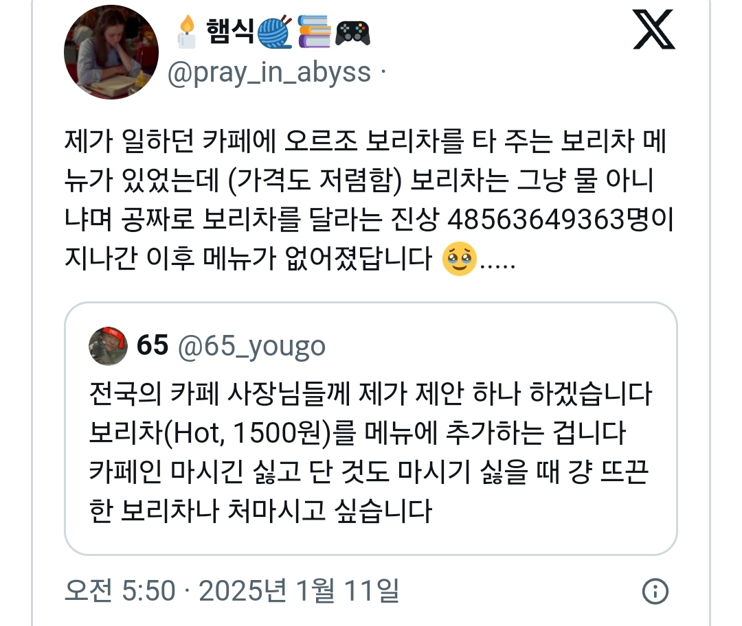 허브차는 보리차보다 별로야... | 25.01.12 19:01 | | |