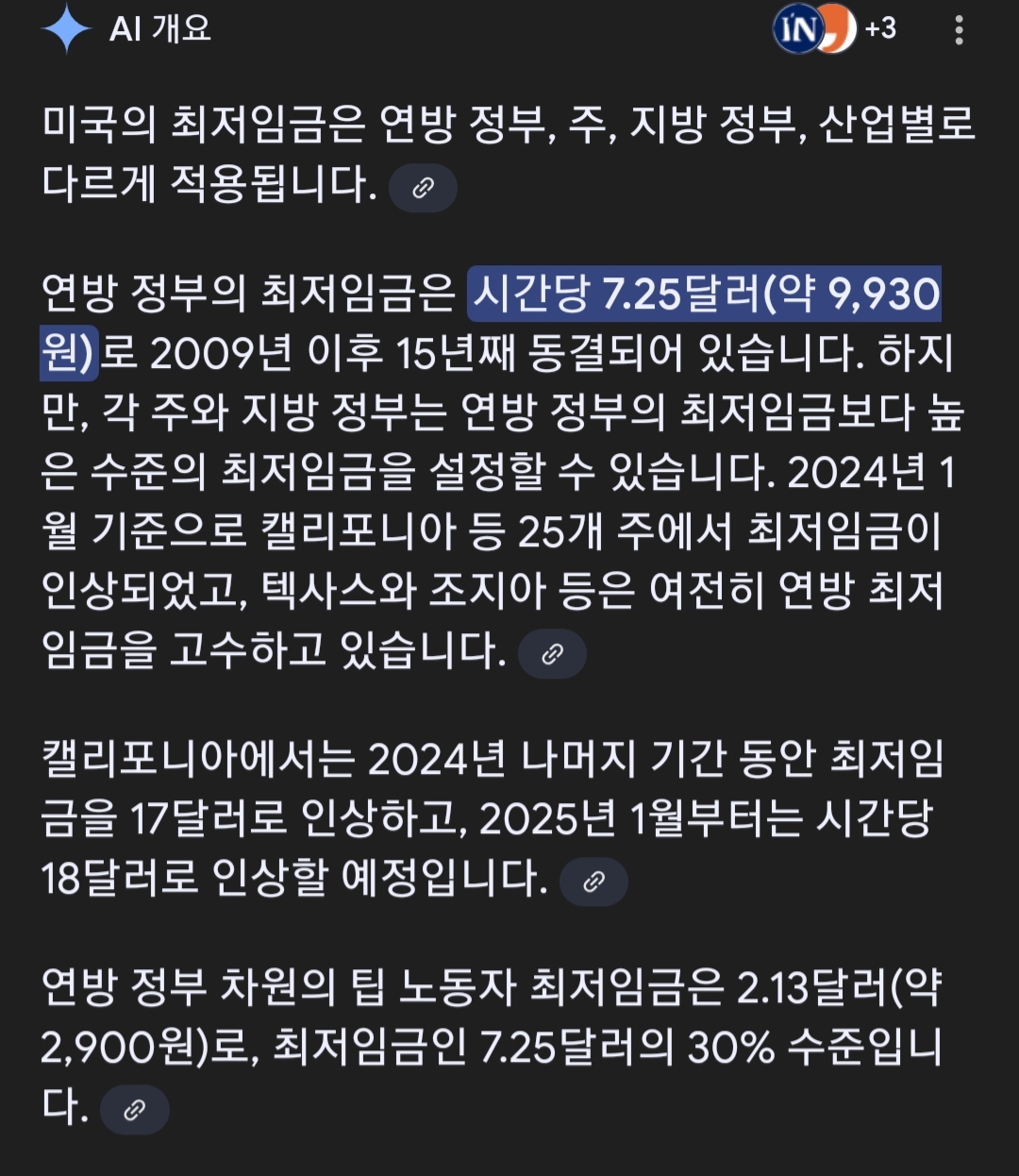 연방법상의 최저임금이 7.25달러고 이게 2009년 적용 뒤부터 지금까지 동결된 건 맞음 ㅋㅋㅋ 주별 최저임금은 더 높기는 할거임 | 25.01.13 10:32 | | |