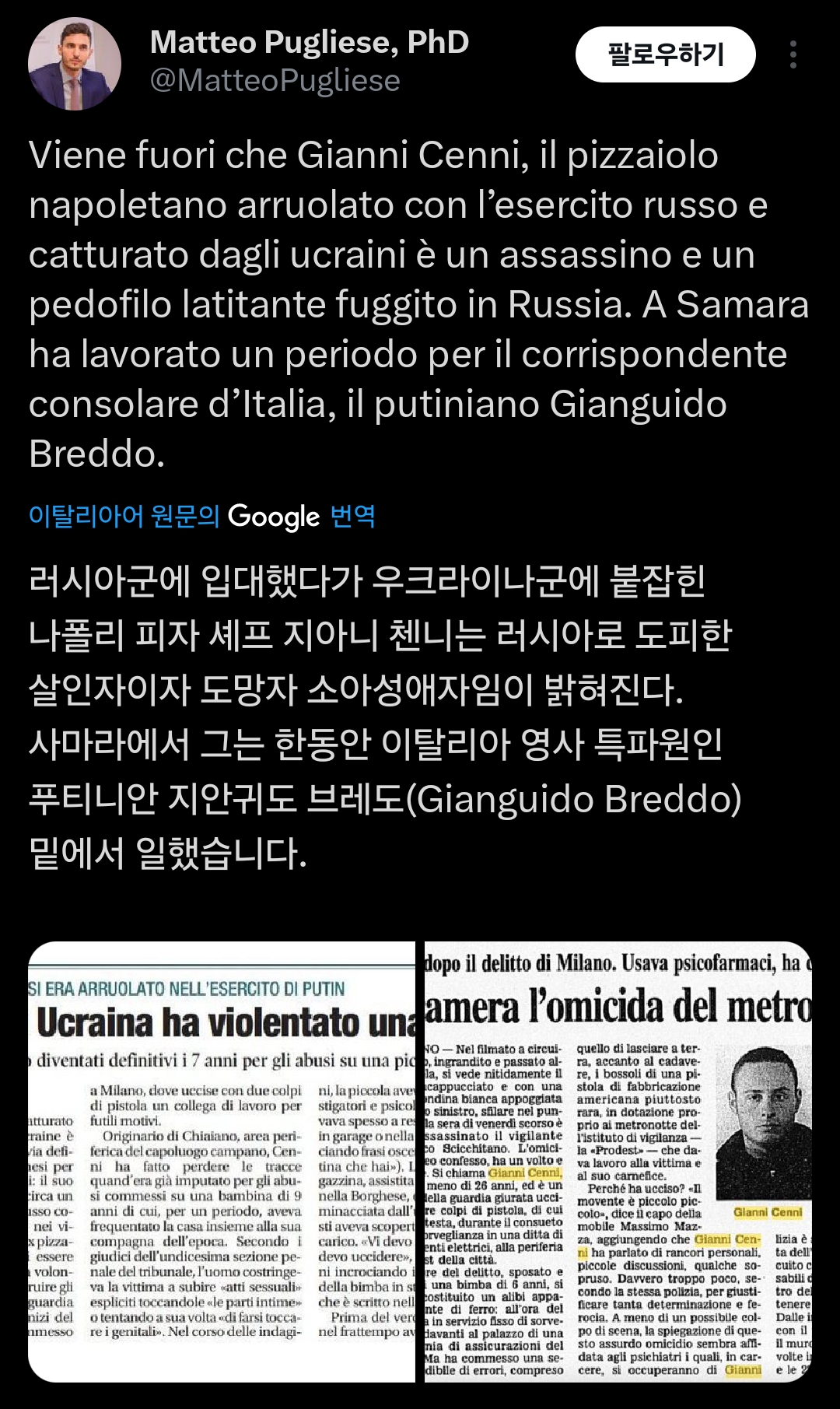 살아있어야 한다 생각해 대신 두 다리는 작살난 상태 그 상태에서 이탈리아까지 기어오게 하고 기어오면 체포하자 | 25.01.13 11:27 | | |
