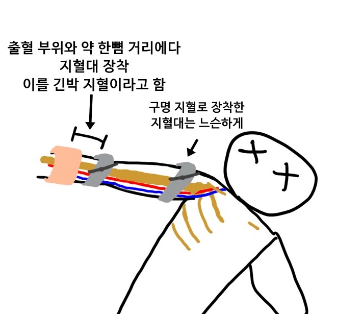 구명지혈(가장 몸통 안쪽)에다 지혈한 지혈대 때문에 만에하나 병원으로 후송이 늦어져서 괴사할 경우를 대비해서 최대한 상처 가까운 곳에다 하나 더 지혈대 붙이고 구명 지혈해놓은걸 느슨하게해서 신체 절단 범위 최소화 시킨다 하드라 | 25.01.14 16:28 | | |