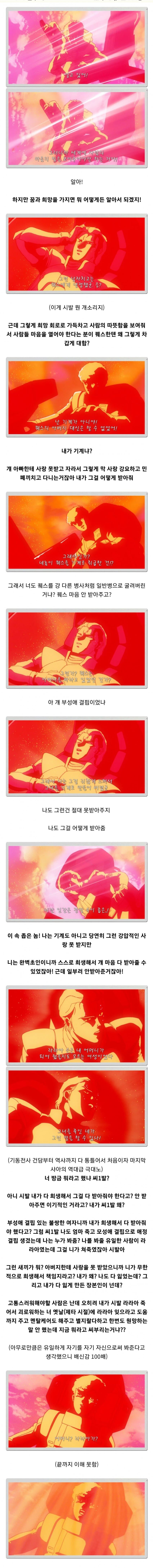 요약: 라라아가 날 인간적으로 더 완성시켜줬을수도 있었는데 그사람 죽인 네가 나를 속좁은 인간 취급하면 내 순정을 모욕하는거얏 건담식 시적인 화법: 응애 라라아 마망 네가 죽였어 나쁜놈