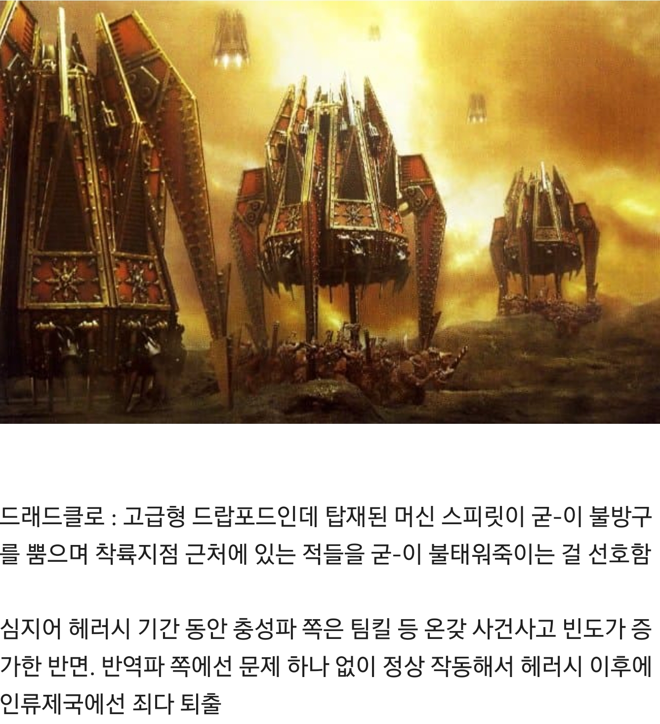드래드클로 : 귀환 기능이 탑재된 고급형 드랍포드인데 탑재된 머신 스피릿이 굳-이 불방구를 뿜으며 착륙지점 근처에 있는 적들을 굳-이 불태워죽이는 걸 선호함