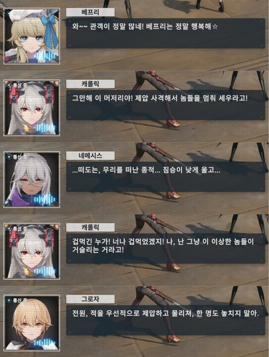뱌라그단이 나타난다 -> 네메시스가 뭐라 떠든다 ->칼토끼가 화낸다 -> 콜펜이 놀린다 -> 그로자가 한숨쉬고 지휘한다 반복 | 25.01.16 19:23 | | |
