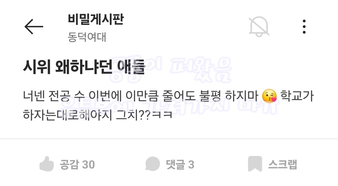 누가보면 뭔 등록금만큼 전공수 안나와서 시위한줄 알겠네 ㅋㅋㅋㅋㅋ '소멸할 지언정 여대로 남는다'가 니들 시위 카피였는데 이제와서 딴소리야 ㅋㅋㅋㅋㅋ