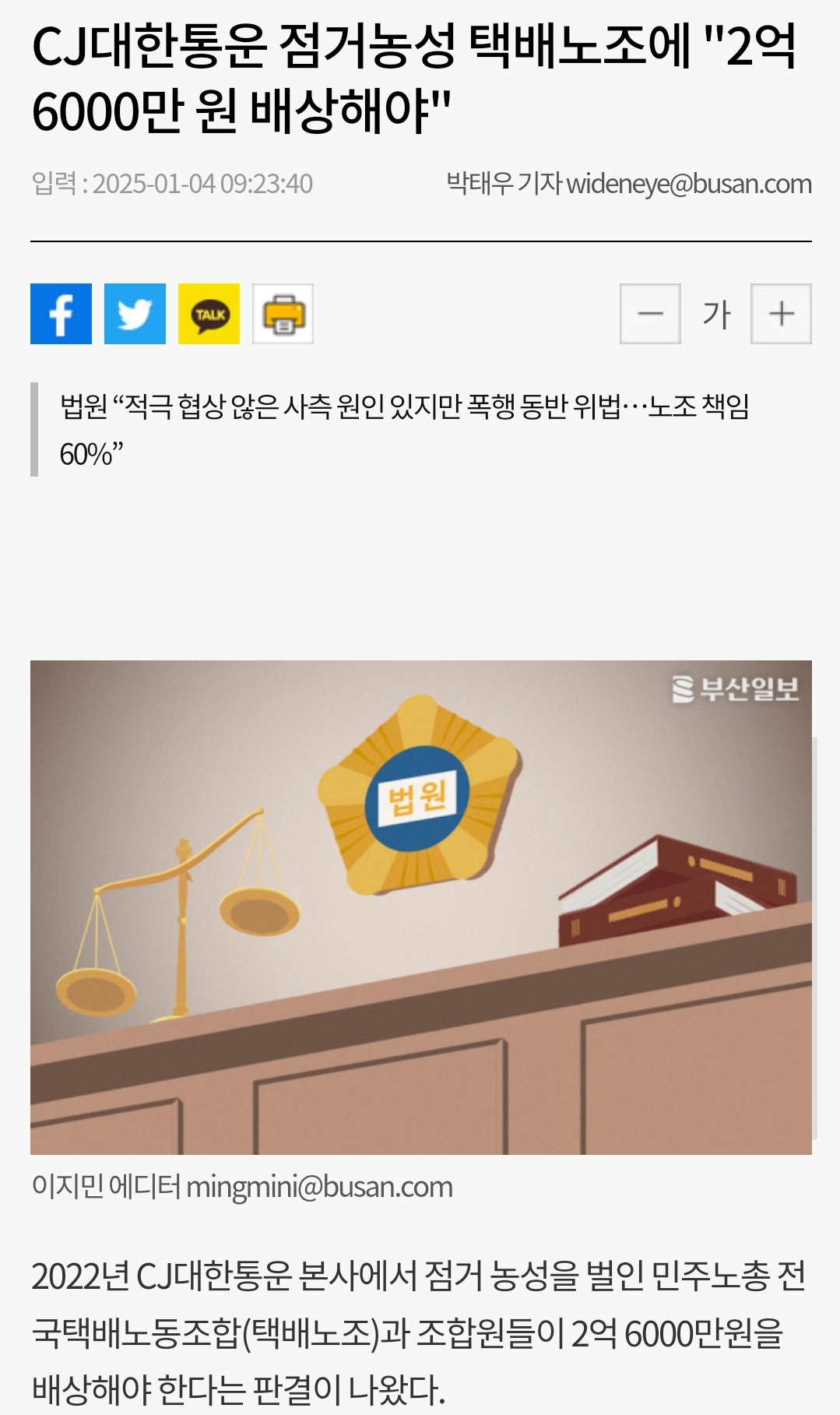 https://mobile.busan.com/view/busan/view.php?code=2025010409201098854 어디 보자아아 판레기 개18색히가 노조한테 배상하라고 판결 때린 게 어이쿠야 올해 1월 4일에도 한 건 있네 21년부터 과로사 방지 해 달라고 요구한 거 쌩까는 건 법적 논쟁도 안 되는데 점거 농성은 바로 손해 배상 때리는 기업 하기 좋은 나라