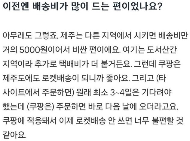 ㅇㅇ 우리 형네도 제주도 사는데 배송 때문에 거의 쿠팡서 사더라 명절 때 내려갔다가 충전기 고장나서 샀더니 명절연휴에도 와서 좀 당황하고 고맙고 그러긴했다만.. | 25.01.17 23:15 | | |