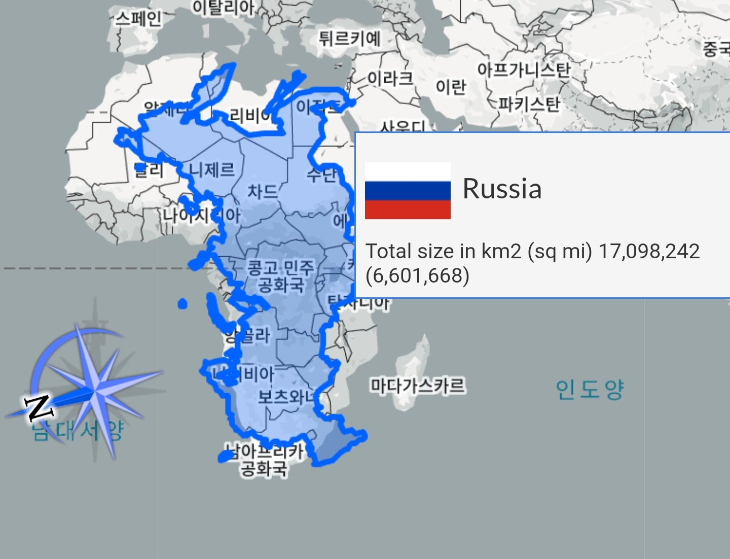 아프리카는 사실 겁나게 크다. 러시아는 반대로 겁나게 과장되어있다