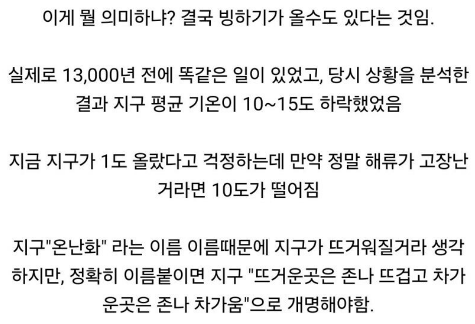 지구 온난화가 계속됨>해류에 이상이 생김>더운곳은 더 덥게, 추운곳은 더 춥게>극지방에 갑자기 빙하가 많아짐>태양빛 흡수율보다 빙하에 의한 반사율이 더 많아지는순간>지구 평균기온이 콱 낮아짐 | 25.01.18 01:46 | | |