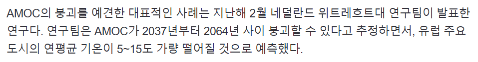 문제가 저 해류 멈추는게 온난화랑 산관없이 갑자기 멈추는 거라고 들음. 도무지 이유도 알수 없고 막을 방법도 없다고.