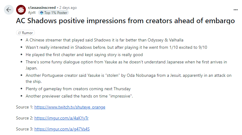 레딧 유저가 체험판 플레이하고 온 크리에이터들 몇 명 반응 수집해서 글 올린 게 원본임. - 레딧글 출처 : https://www.reddit.com/r/assassinscreed/comments/1i2nxgb/ac_shadows_positive_impressions_from_creators/?rdt=55284 | 25.01.18 14:17 | | |