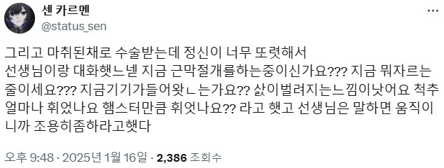 의사 : 맞어. 입을 마취해야 했던거 같아 (수술내내 시끄러움) | 25.01.19 05:50 | | |